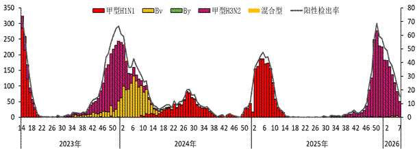 2026年第7周,全省流感监测网络实验室对哨点医院送检标本进行了检测,流感病毒阳性检出率持续下降,均为甲型H3N2流感。(见图2)