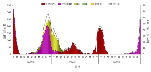 2025年第49周,全省流感监测网络实验室对哨点医院送检标本进行了检测,流感病毒阳性检出率持续上升,以甲型H3N2流感为主。(见图2)