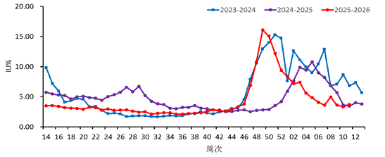 2、流感样病例百分比:流感样病例占门急诊就诊病例的比例。
