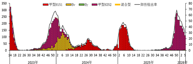 2026年第5周,全省流感监测网络实验室对哨点医院送检标本进行了检测,流感病毒阳性检出率持续下降,以甲型H3N2流感为主。(见图2)