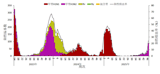 2025年第47周,全省流感监测网络实验室对哨点医院送检标本进行了检测,流感病毒阳性检出率持续上升,以甲型H3N2流感为主。(见图2)