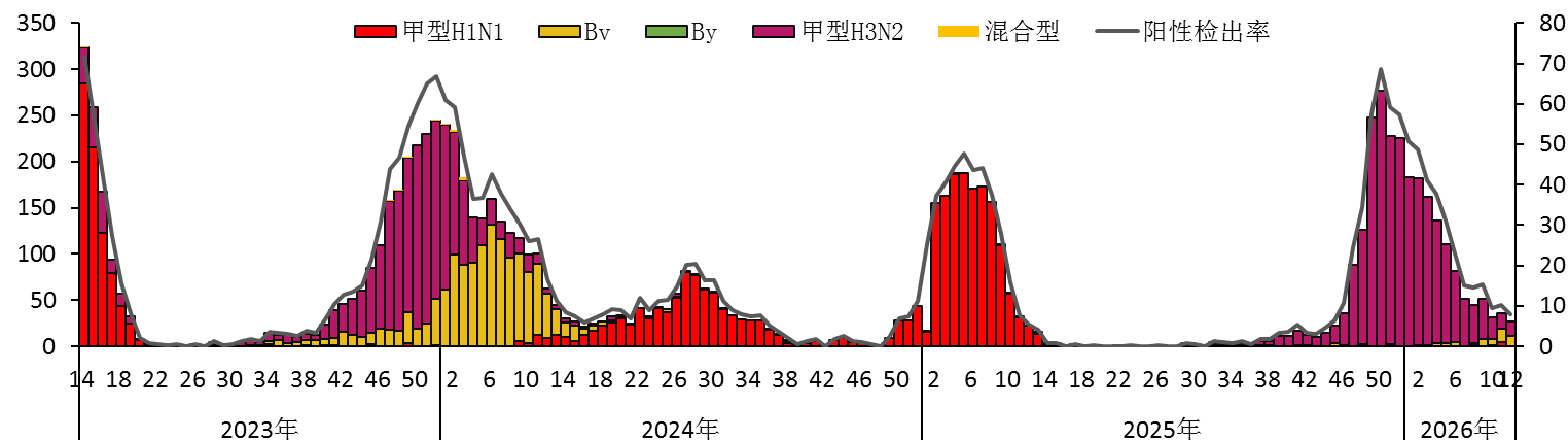 2026年第12周,全省流感监测网络实验室对哨点医院送检标本进行了检测,流感病毒阳性检出率下降,以乙型流感病毒Victoria系和甲型H3N2流感为主,乙型流感病毒Victoria系占比持续上升。(见图2)