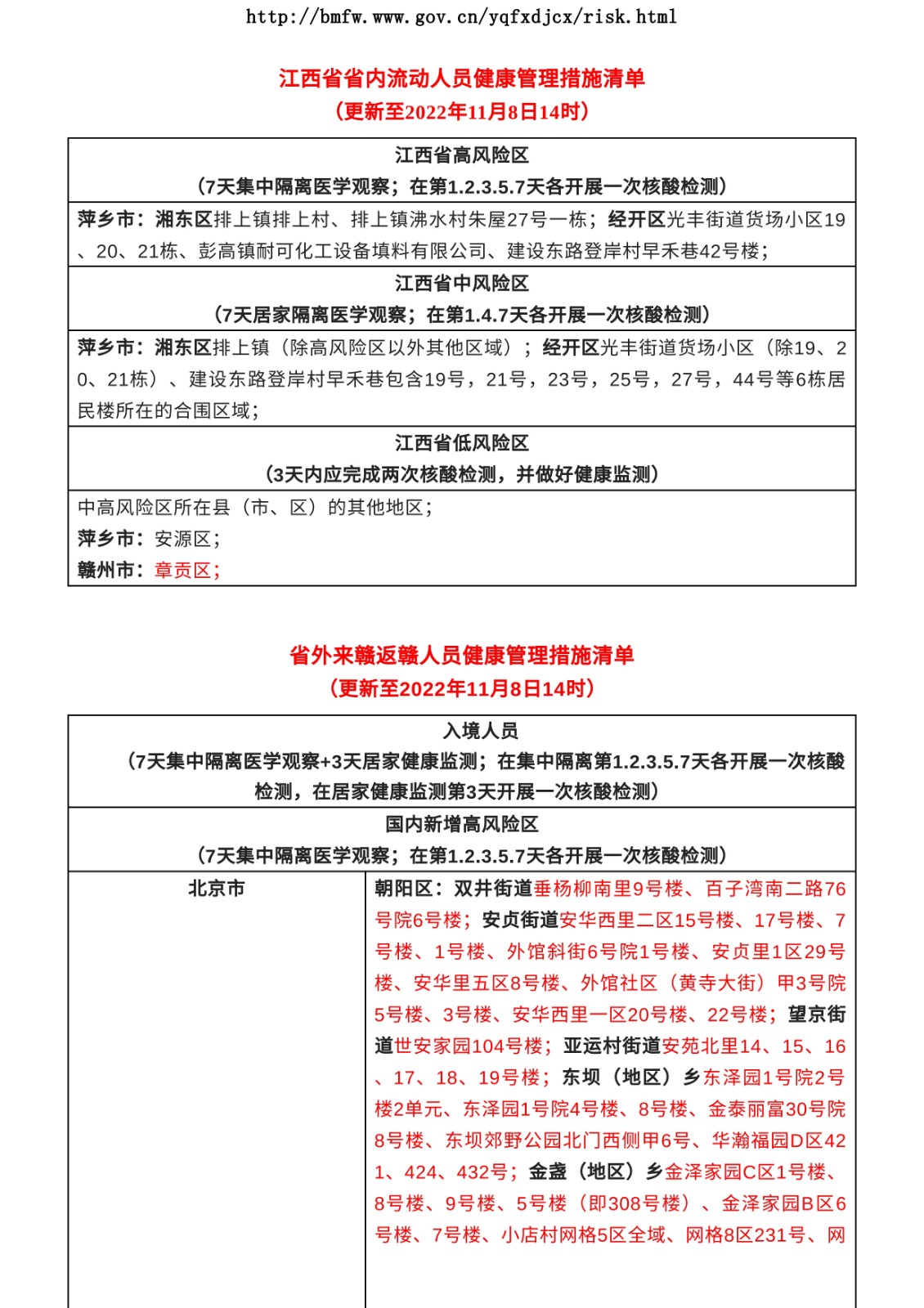 为防范疫情输入,保障人民群众身体健康,请来自中高风险区和近7天有本土疫情的县(市、区)来赣返赣人员提前向属地报备,按照属地要求配合落实疫情防控措施和个人责任,对故意隐瞒、不按要求报备或拒不配合落实防控措施等造成疫情传播的,公安机关将依法追究其法律责任。来赣返赣人员可在国务院小程序或中国政府网,以及全国各地官方公布的疫情和风险区通报上,提前了解始发地和目的地是否为中高风险区或近7天内发生本地疫情。截至2022年11月8日14时,全国共有高风险地区3398个,中风险地区2575个。