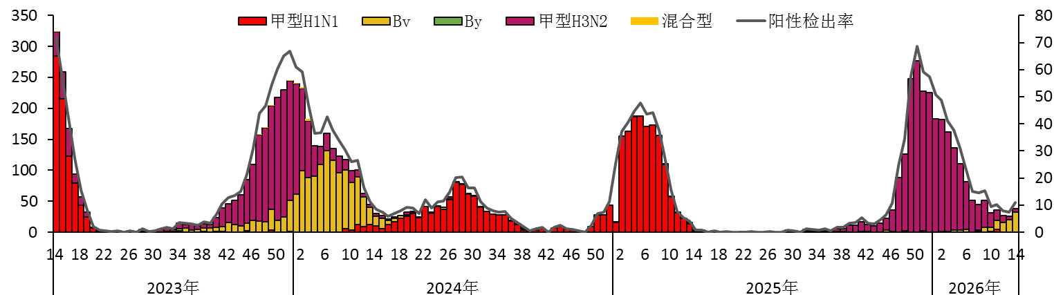2026年第14周,全省流感监测网络实验室对哨点医院送检标本进行了检测,流感病毒阳性检出率上升,以乙型流感病毒Victoria系流感为主。(见图2)