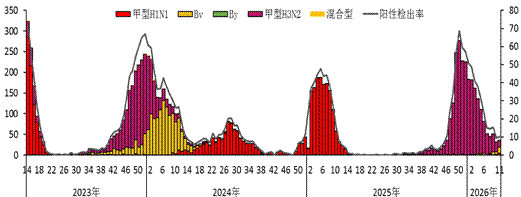 2026年第11周,全省流感监测网络实验室对哨点医院送检标本进行了检测,流感病毒阳性检出率略有上升,其中甲型H3N2流感、新甲型H1N1流感和乙型流感病毒Victoria系均有检出,以甲型H3N2流感和乙型流感病毒Victoria系为主,其中乙型流感病毒Victoria系占比上升。(见图2)