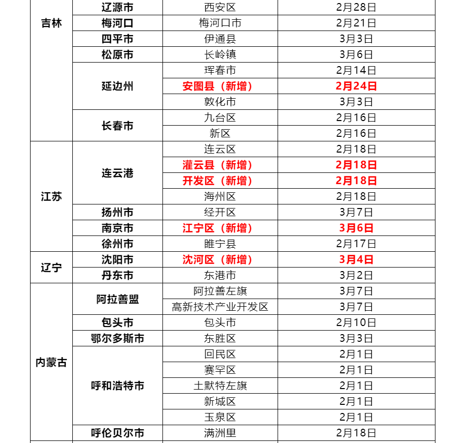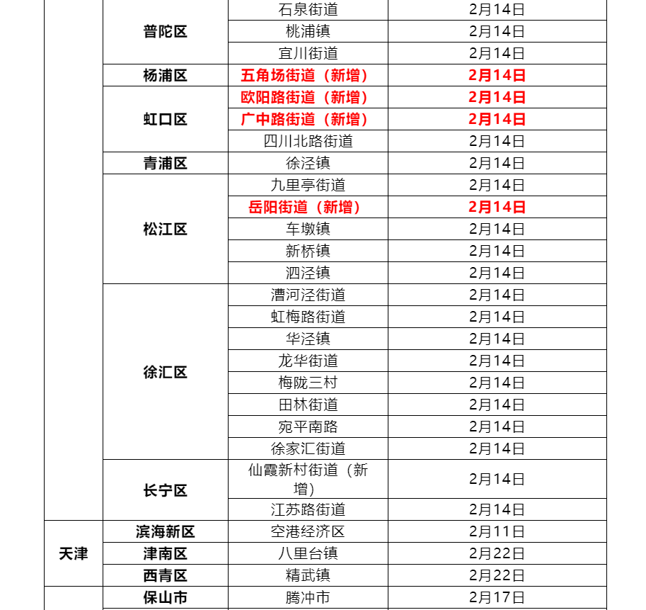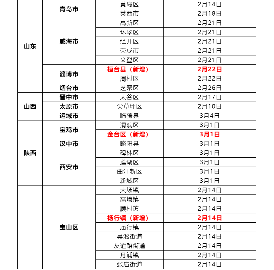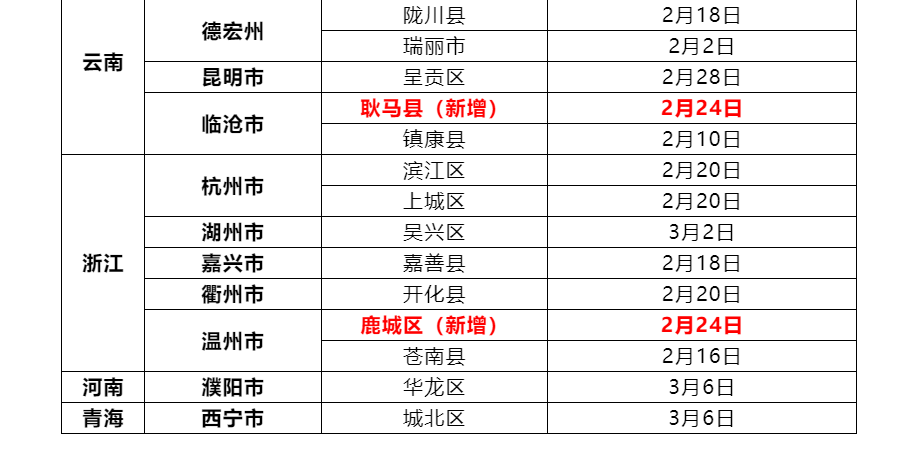 五、相较2022年3月9日,湖北省武汉市东湖高新区、江岸区、硚口区、青山区,四川省成都市高新区、眉山市仁寿县,云南省红河州河口县(返)赣人员,各地按低风险地区人员管控要求实施。