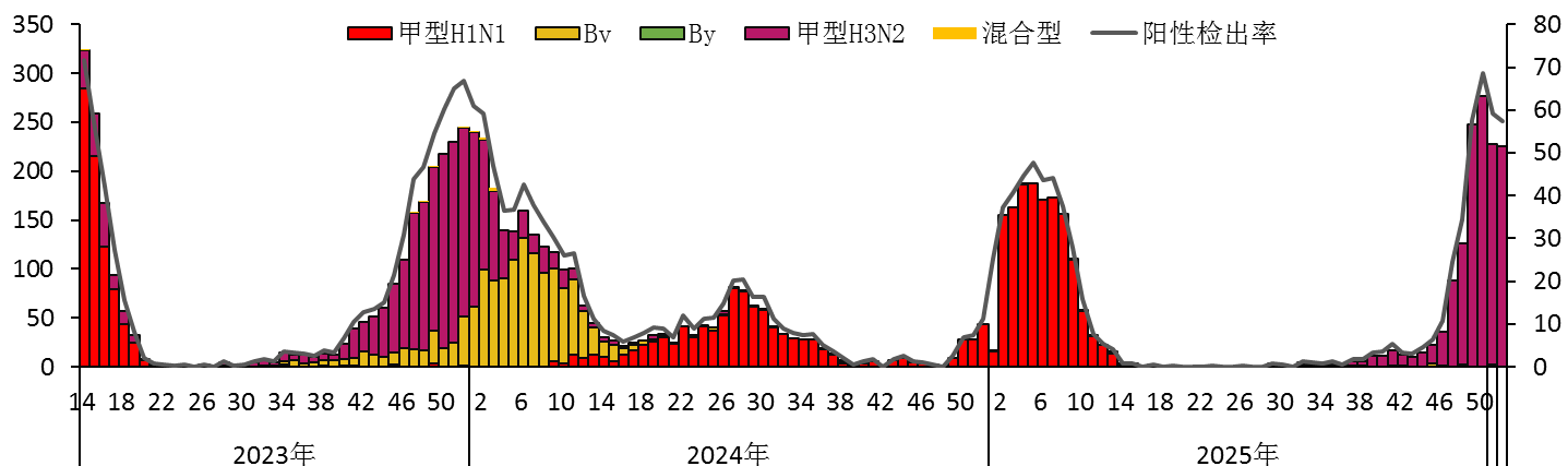 2025年第52周,全省流感监测网络实验室对哨点医院送检标本进行了检测,流感病毒阳性检出率出现回落,均为甲型H3N2流感。(见图2)