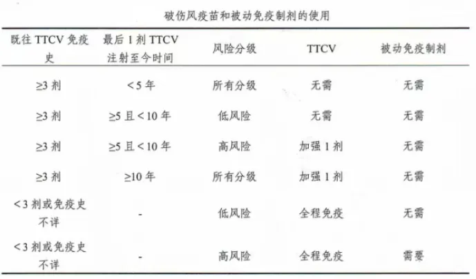 婴儿出生后满2、4、6月龄各接种1剂百白破,18~24月龄时加强1剂百白破,6岁时再加强1剂百白破;成人无主动免疫史或免疫史不详的,可在0、1、7个月各注射1剂破伤风疫苗,如果伤口污染相对较重的,需要联合使用破伤风人免疫球蛋白(TIG)或破伤风抗毒素(TAT)来进行短暂保护,为主动免疫产生抗体争取时间。